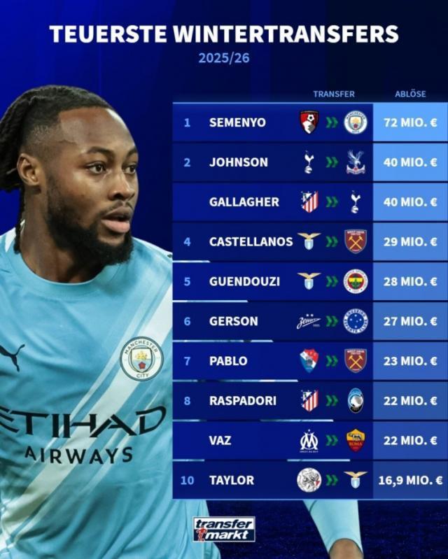 2025-26赛季冬季转会窗转会费排行:塞梅尼奥7200万欧居首